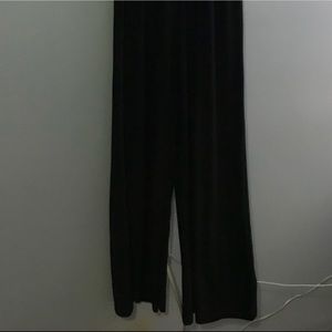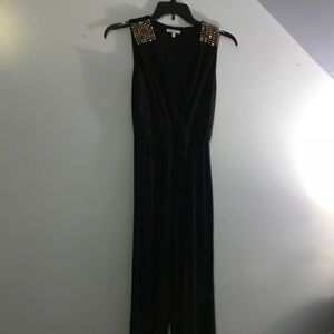 Black jumpsuit with gold spikes detailing on shoulders, wide leg