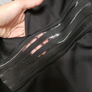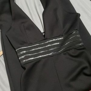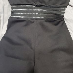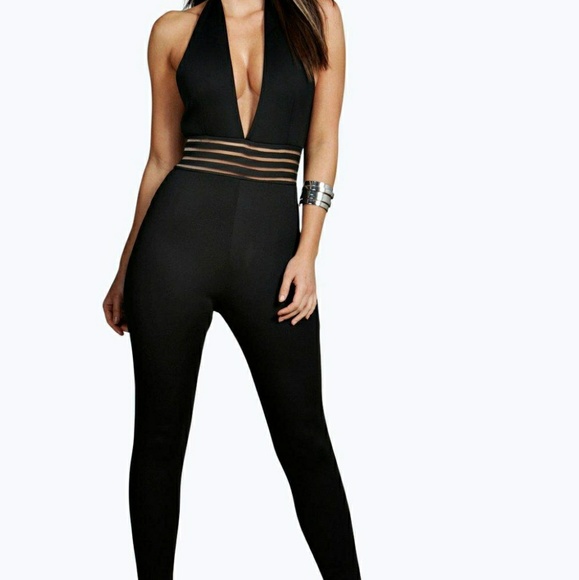 Black jumpsuit, skinny fit. I took a picture of the area that is practically "see-through" just so you can have a better visualization on how your skin might show through. Enjoy!