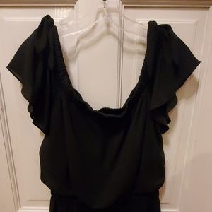 Black jumpsuit with elastic waist and short ruffled sleeves with tie ribbon on top