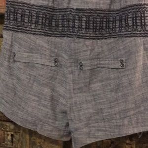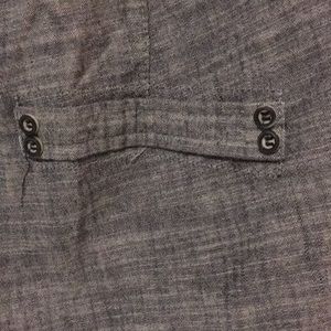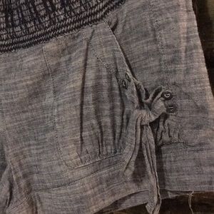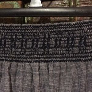 Blue jean denim, very light. Strapless elastic around top and waist. Pockets in front. No damage, rarely worn. Size S 0-2