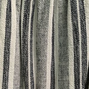 Spaghetti straps and a sinched waist, gray and white and blue stripes and has pockets