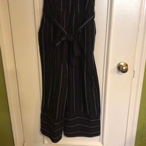 Universal Thread V-neck jumpsuit with 1” straps. Navy blue with red and white vertical strips, Bottom 7 1/2” are horizontal stripe. Side pockets and belted waist. Inseam is 23”. 100% cotton.