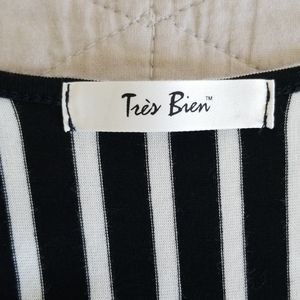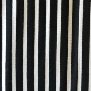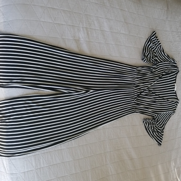 Only worn once. Black and white stripe jumpsuit. V-neck plunge with flutter sleeve and cinched waist. It is 96% rayon 4% spandex. Very comfy and soft.