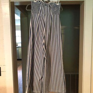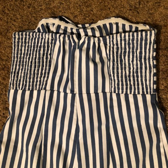 Size small. Strapless, capris jumpsuit. Brand: Sugar & Lips. This jumpsuit hits lower calf, closer to ankle and I am 5'7". The top is twisted and the sides of jumpsuit are stretchable. I wore block wedge heels with this outfit. I wore it one time, to a rehearsal dinner.