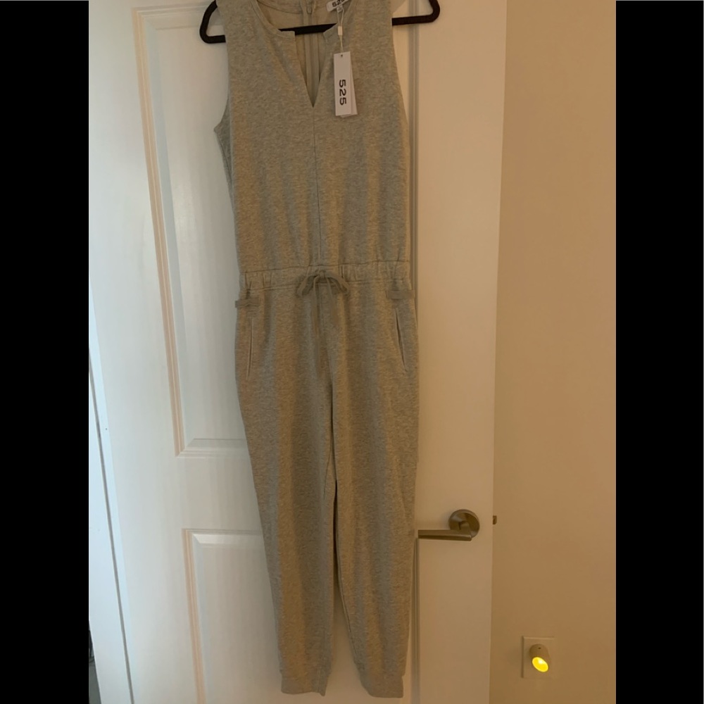 Open v-neck French terry jumpsuit . Relaxed fit , very comfy . Sleeveless , drawstring with hidden zipper in back. 60% cotton 40% poly.
