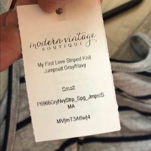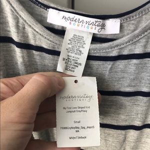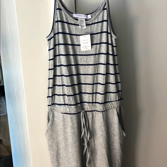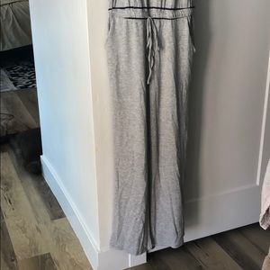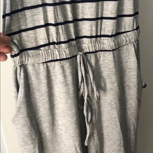 NWT Grey with blue stripes. Ties in front has pockets. Very comfy, cute, and casual wide leg jumpsuit.