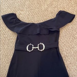 Fitted black jumpsuit with attached silver statement belt
