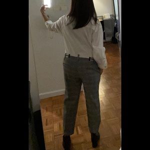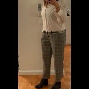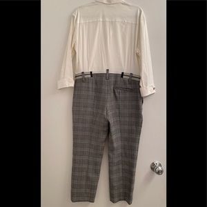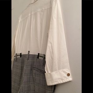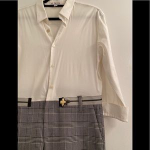 One of a Kind jumpsuit by Uli Herzner. White button down top with plaid pants. Zippered waist band detail with a bumblebee decal. Very chic. Wear with booties or sneakers.