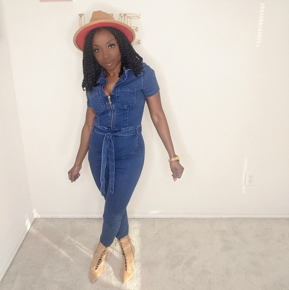 Our "Kelly" jumpsuit is a win-win! It has two side pockets, with a self tie belt, a front zipper and two other pockets in the chest area. It is very stretchy and super comfy! Model is wearing a small and stands 5'0".