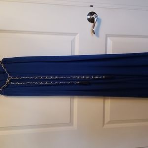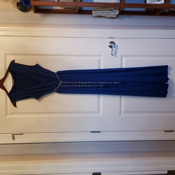 Royal blue jumpsuit, belt, v-neck, sleeveless, elastic waist.