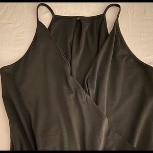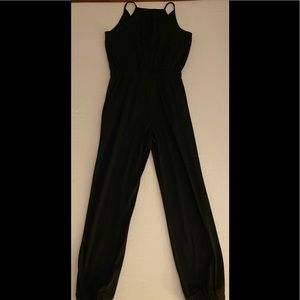 Black thin strap jumpsuit w/elastic waist that ties. V neck wrap front.