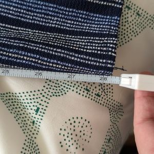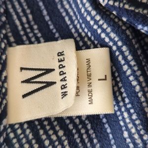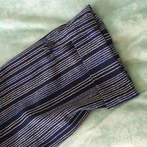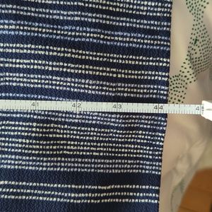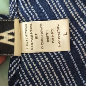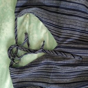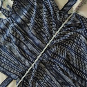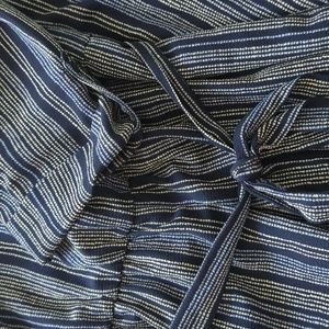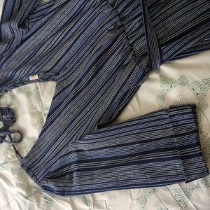 Lightweight jumpsuit - great for summer. Navy with light blue and white details. V-neck on front and back with an attached belt. 3/4" sleeves with a decorative cuff. 28"-29" inseam and about 44" from waistline. About 16" elastic waistband.