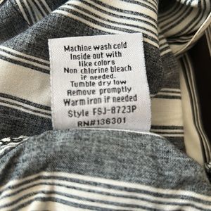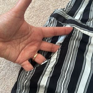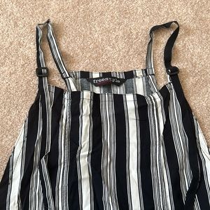 Striped navy and white jumpsuit, side zipper, front and back pockets, adjustable shoulder straps. Excellent condition. Inseam 28 inches. Waistband 17 inches