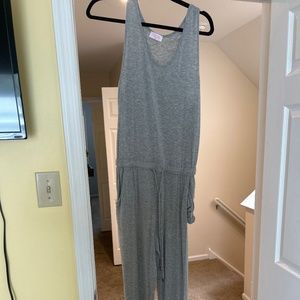 Worn once; grey jumpsuit; tank top with pockets; drawstring around waist; jogger like bottom