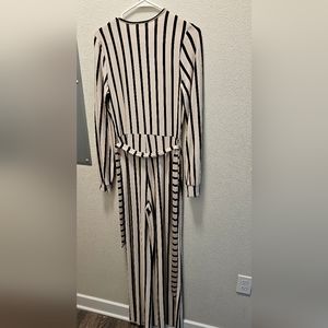 striped, cream with black stripes, never worn, brand new with tags, long sleeve, wide leg bottom