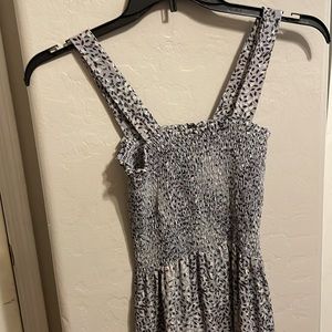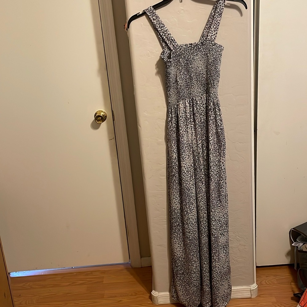 This pretty lightweight tank style jumpsuit has a stretch top measuring 13 inches pit to pit, wide legs and total length of 55 inches. 28 inch inseam. Small LB