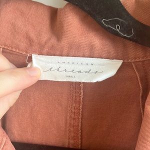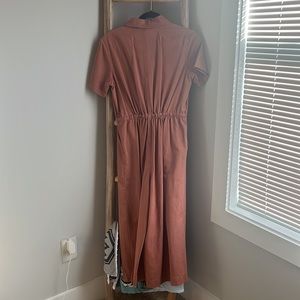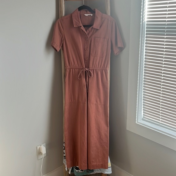 Super cute jumpsuit. Maybe worn once or twice, in new condition. Really cute color. Waist cinches so it’s super flattering and adjustable. Pet free, smoke free home. Can fit someone between small/medium.