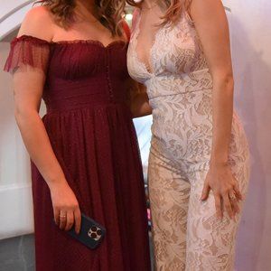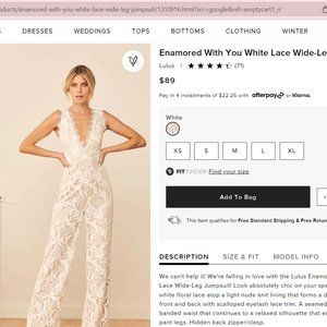 With You White Lace Wide-Leg Jumpsuit! Look absolutely chic on your special day with intricate, white floral lace atop a light nude knit lining that forms a deep V-neckline at the front and back with scalloped eyelash lace trim. A seamed bodice tops a high, banded waist that continues to a relaxed silhouette that ends at trendy, wide pant legs. Hidden back zipper/clasp.