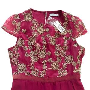 Jun Ivy Dress Berry Gold Floral Brocade Cap Sleeve Pleated Fit Flare Medium NEW