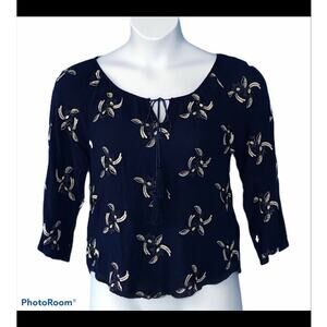 Add a breezy, feminine touch to your spring/summer wardrobe with this Jun & Ivy embroidered blouse, size Small. Features blue floral embroidery on soft white fabric, a scoop neckline with tassel ties, and a relaxed, flowy fit. Lightweight and breathable—perfect for casual days, beach trips, or music festivals. 3/4 sleeves, flattering shape, excellent pre-owned condition.
