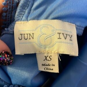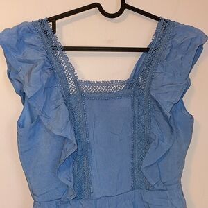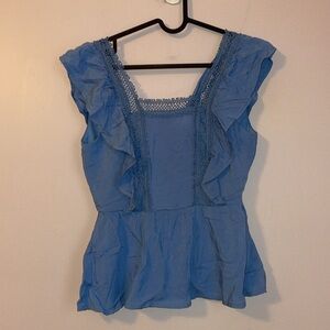 Jun & Ivy Fancesca’s Blue Crochet Detail Peplum Open Back Blouse size XS. New with tags! Cute ruffle details on front. Open back with zipper closure. Tie in back. Lined. Boho flirty top. See pictures for approximate measurements.
