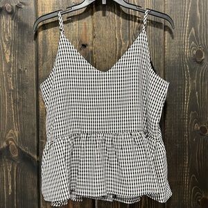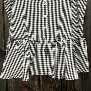 Jun & Ivy brand gingham plaid crop top. Size medium. Sleeveless. Adjustable spaghetti straps. Black & white. Button front. Flared / ruffled hem. Peplum look. Great for Spring / Summer / Fall. Dress up or down. Preloved. Please see all photos for condition.