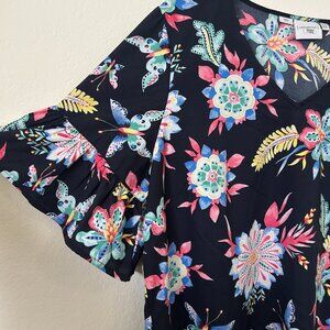 Junarose Top Womens 14 Black Allover Floral Print Short Ruffle Sleeve Blouse