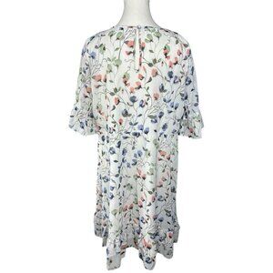 Junarose Rent The Runway women's size 14 dress, it is a Fit & Flare style, floral print, white, green, orange, blue and black color, short sheer ruffle sleeves, v-neck accent neckline, tapered waist, sheer overlay with lining, tiered ruffle hem and hidden side zip closure. Materials 100% polyester. Care machine wash cold, tumble dry low. MFSR $179.00 Condition is preloved good with three tiny stains on front as shown in pictures. Please preview the measurements to ensure fit.