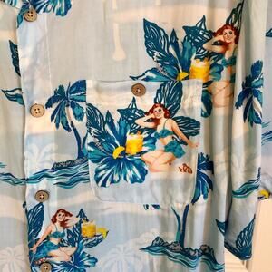 Junction West Button Down Shirt - Short sleeve, button pocket, soft and breezy Rayon, light blue with a pin-up girl, tiki cocktails, hibiscus flowers, and palm tree islands.