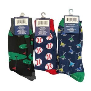 Juncture Three Pack Lot of Men's Crew Socks in Black and Blue with Athletic Designs of Baseballs, Golf Greens with Flags and Golf Balls and Colorful Martini Glasses. Never be without your favorite pair. These comfortable socks are made from soft combed polyester mix for shock absorption and all day comfort.