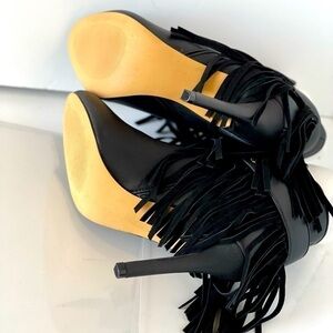NEW In Box! June Ambrose Black Leather Fringe Ankle Boots Booties Stilleto Heels Pumps, Sz 6.5W