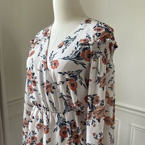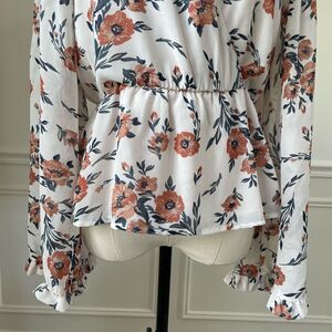 June & Hudson trumpet or bell sleeve Peplum cross front blouse. White with terra-cotta color flowers. Lined. Laying flat measures approximately 23 inches shoulder to hem and 20 inches armpit to armpit.