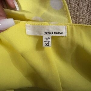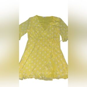 Chic yellow mini dress with playful polka dots. Features a stylish wrap design and flutter sleeves. Perfect for sunny days.