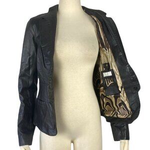June black leather jacket blazer with two button closure and two small front pockets. Please see pictures for more details. Measurements taken with item laying flat. Approximate measurements: