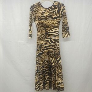 Jungle Animal Print Midi Dress Tan Black stretch 3/4 long sleeve v neck Rouched