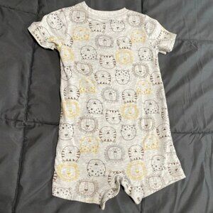 Cotton romper by Carter’s with snap bottom, size 24 months. Gray color with a big pocket on the front and lions, tigers, and cheetahs (or leopard?) in yellow, brown and gray. Great condition!
