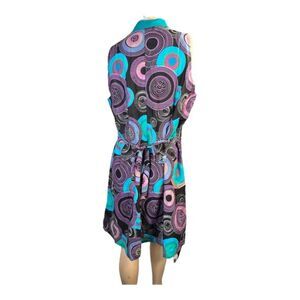Make a bold statement with this vibrant sleeveless tunic dress by Jungle Billee. Featuring an abstract circular print in bright pops of purple, teal, and turquoise on a black background, this lightweight cotton dress is perfect for warm weather, beach days, or casual outings.