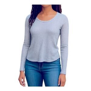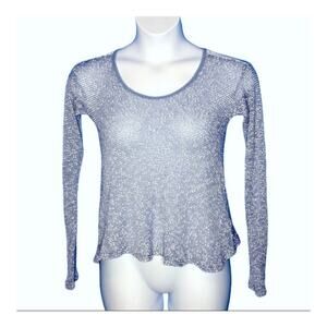 This Junie and Jade lightweight sweater is a beautiful addition to any wardrobe! In excellent pre-owned condition, this light blue sweater features long sleeves and unique white bubble stitching that creates a charming popcorn texture. The open stitching is intentional and adds to the sweater's unique design. Delicate lace detailing on the back of the shoulders and a flattering flared hemline add a touch of elegance.