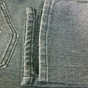 Medium wash, straight leg 70% cotton 28% polyester 2% spandex Approx measurements - laid flat Waist 16" Inseam 31" Rise 9.5" D037