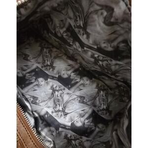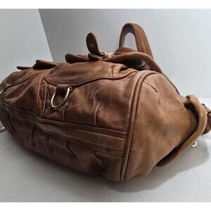 * Made from genuine leather with a distressed finish, this large rectangular bag features a zip closure, silver hardware accents, and tan leather double handles.