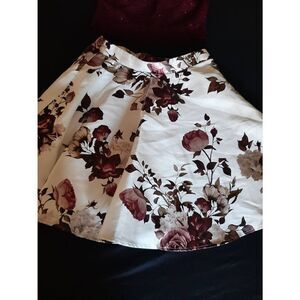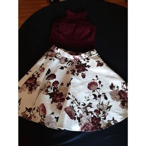 Turn heads with this stunning burgundy, off-white, and silver floral two-piece semi formal, formal, party, prom, homecoming, wedding, bridal, bridesmaid, evening crop top and skirt set dress by City Triangles.