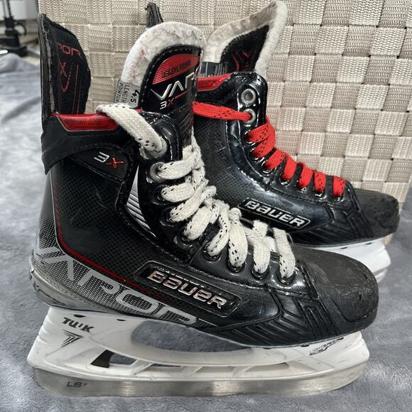 The product is a pair of Bauer Vapor 3X Ice Hockey Skates in size 4.5 designed for junior players. These black skates are specifically made for ice hockey and are part of the Bauer brand. Perfect for young ice hockey enthusiasts looking for quality and performance on the ice.