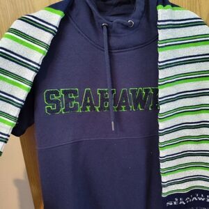 Stay warm and stylish with this Seahawks navy blue hoodie. Perfect for fans, this comfortable sweater features a bold design. Ideal for casual outings or game days. excellent use condition junior size small with scarf short sleeved