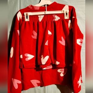 Junior Size Small, Two Tone Heart Print, Boxy Sweater and Short Set Sleepwear. Terry Cloth feel material. Short with Wait Elastic. Shorts have Buttons as design, not functional.