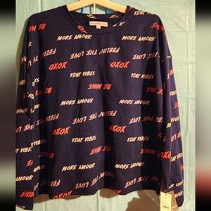 Sweater has words as XoXo, Be Mine, Feelin the Love, and Vday Vibes.