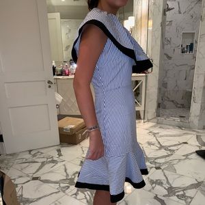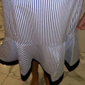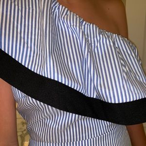 Gorgeous junior size xs dress with and blue striped woth one shoulder ruffle detail
