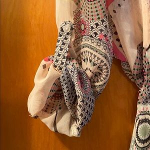 V-neck with button front closure, and long roll-tab sleeves. 100% polyester
