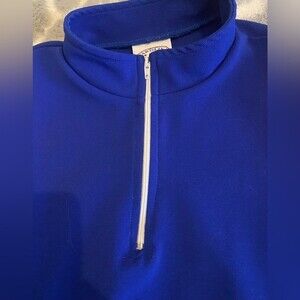 Beautiful bright blue and orange ribbed crop top with 1/3 zip front with stand up collar and white rubbing. EUC no snags, stains or rips. Smoke free home. 19-L 19- across chest.