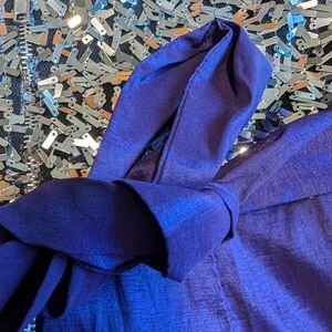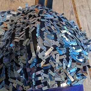 This stunning cocktail dress features a sleeveless design with spaghetti straps and a sheath silhouette. The bodice is adorned with intricate silver sequin embellishments, while the ruched waistband adds a touch of elegance. Perfect for a night out, the dress showcases a rich purple color that complements its sophisticated style. Zipper is functional. Tie/ribbon backing. City Studio, juniors size 5.