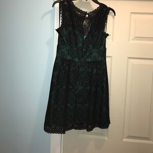 Just above knee length dress. Green dress with black crochet on top. Zipper middle with peekAboo back and button at neck. Sleeveless. Worn twice.
